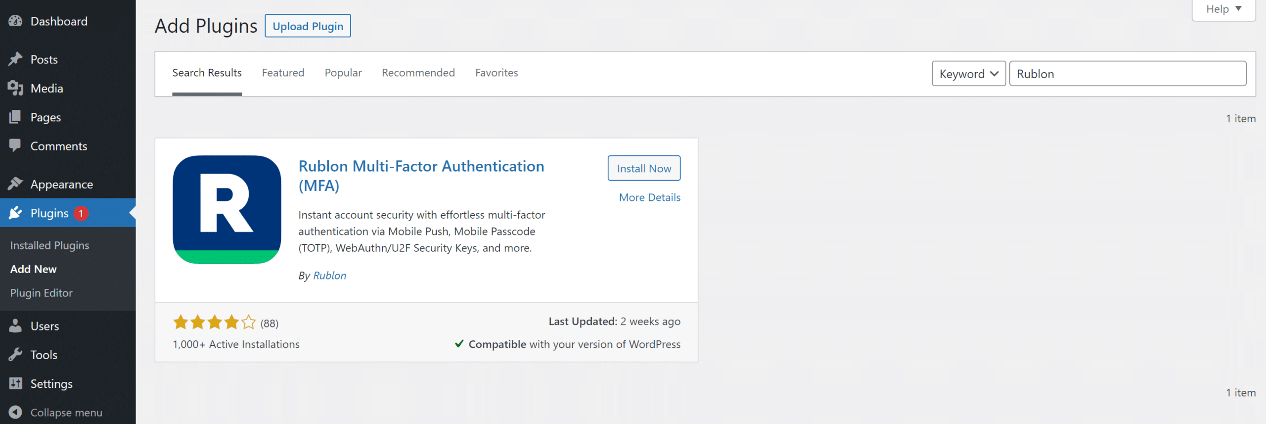 3. Click the Install Now button inside the Rublon plugin box in the search results.