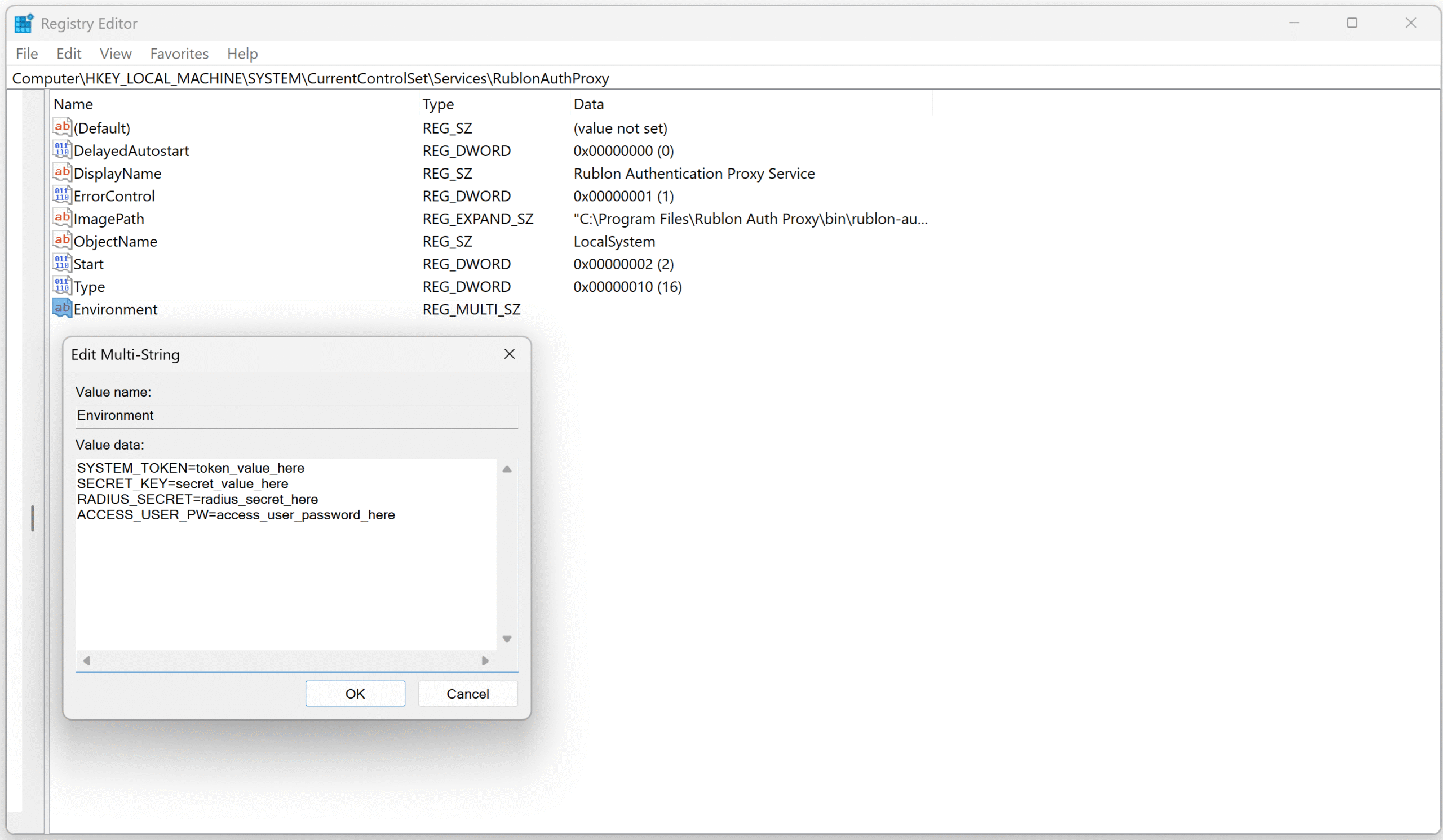 2. Navigate to Computer\HKEY_LOCAL_MACHINE\SYSTEM\CurrentControlSet\Services\RublonAuthProxy.