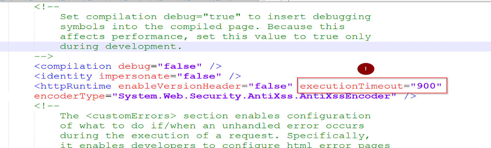 <httpRuntime enableVersionHeader="false" executionTimeout="600" encoderType="System.Web.Security.AntiXss.AntiXssEncoder" /> - And change the value of executionTimeout to the desired timeout value in seconds