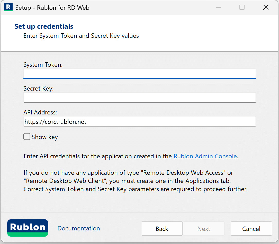 3. Enter the API credentials (System Token and Secret Key) from your application of type Remote Desktop Web Client in the Applications tab of the Rublon Admin Console and click Next.