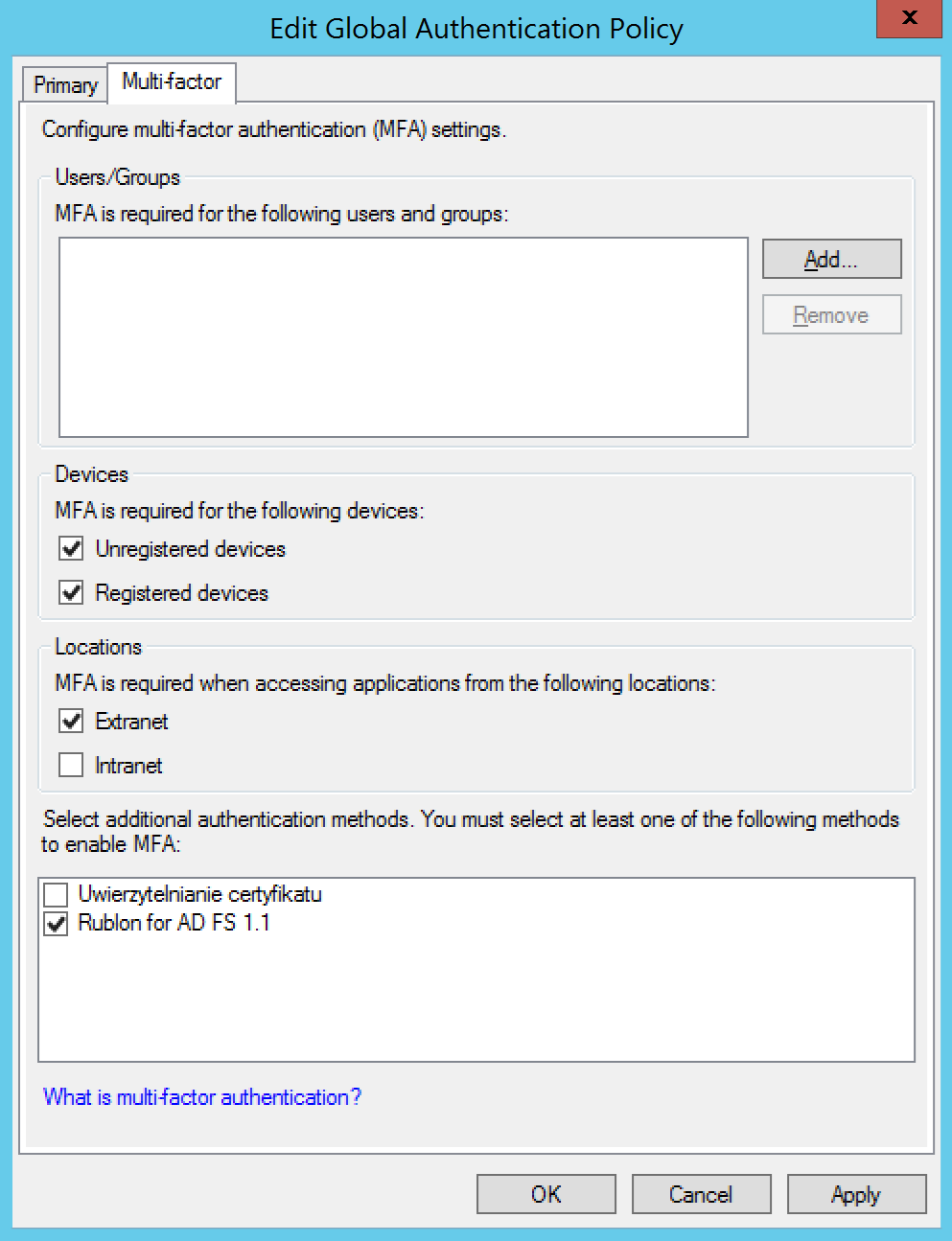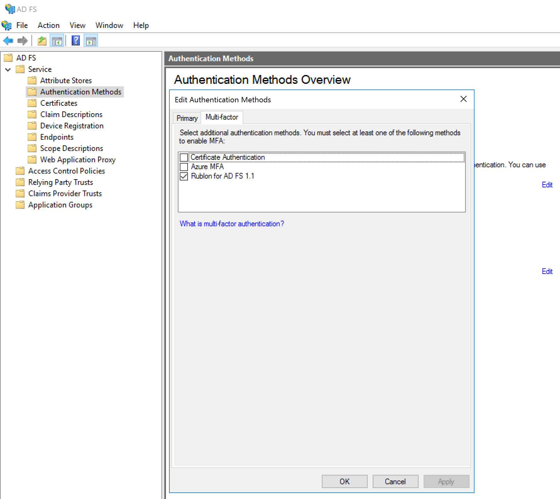 2. Ensure Rublon for AD FS is selected in additional authentication methods of the Multi-factor tab.