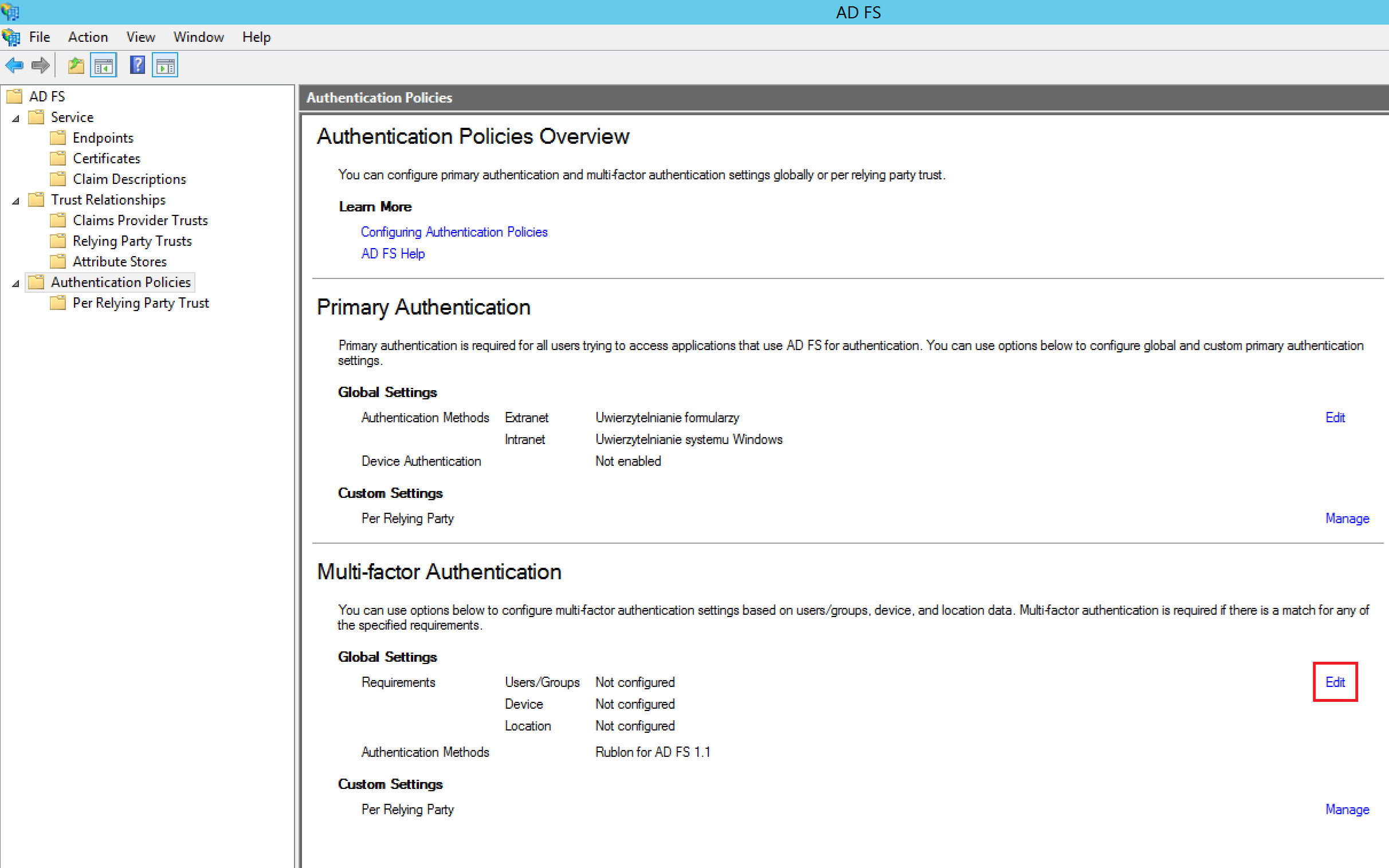 1. Open the AD FS Management, go to Authentication Policies, and select Edit next to Global Settings in the Multi-factor Authentication section.