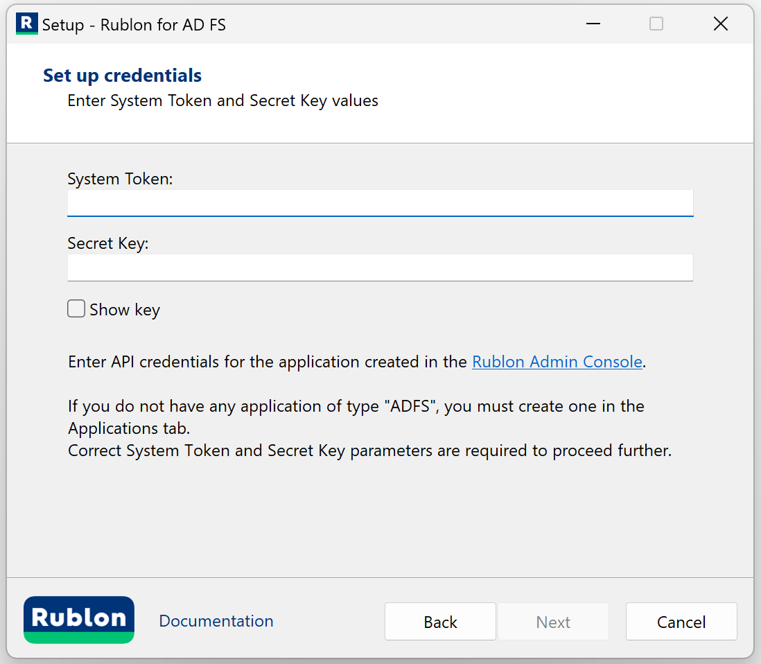 4. Enter the API credentials (System Token and Secret Key) from your application of type Active Directory Federation Services (AD FS) from the Applications tab of the Rublon Admin Console (the values you copied before), and click Next.