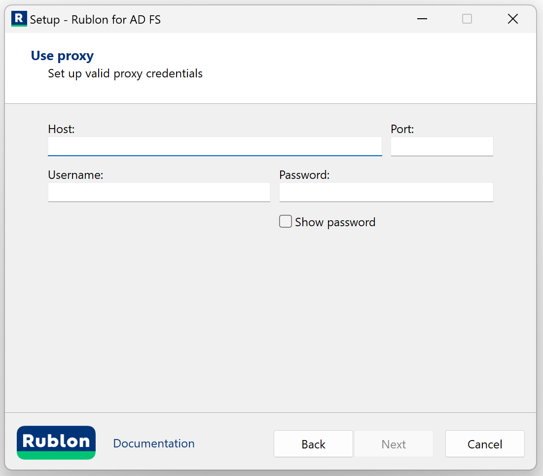 6. If you checked Use proxy on the previous page, you will see an additional page asking you to enter proxy details. After filling in the details, click Next. Refer to the following image and table.