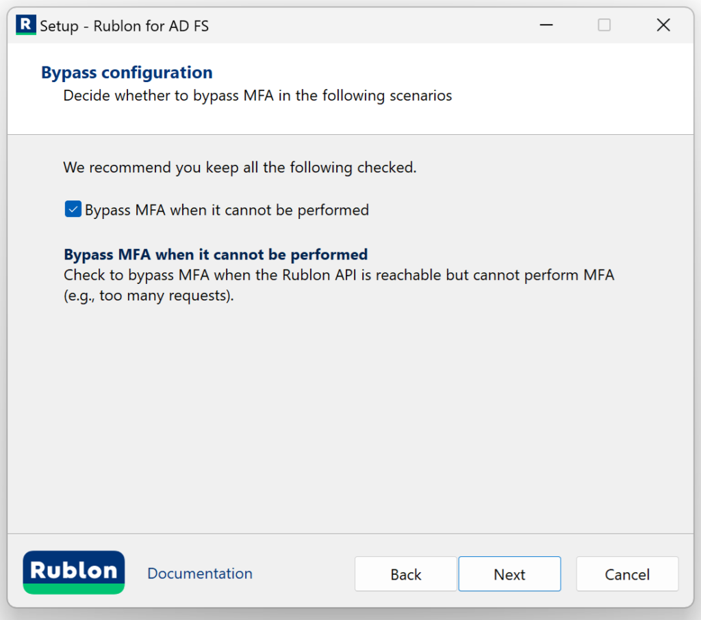 | Bypass MFA when it’s not feasible | Check to bypass MFA when the Rublon API is not reachable (no internet connection or API down) or when the Rublon API is reachable but cannot perform MFA (e.g., too many requests). |