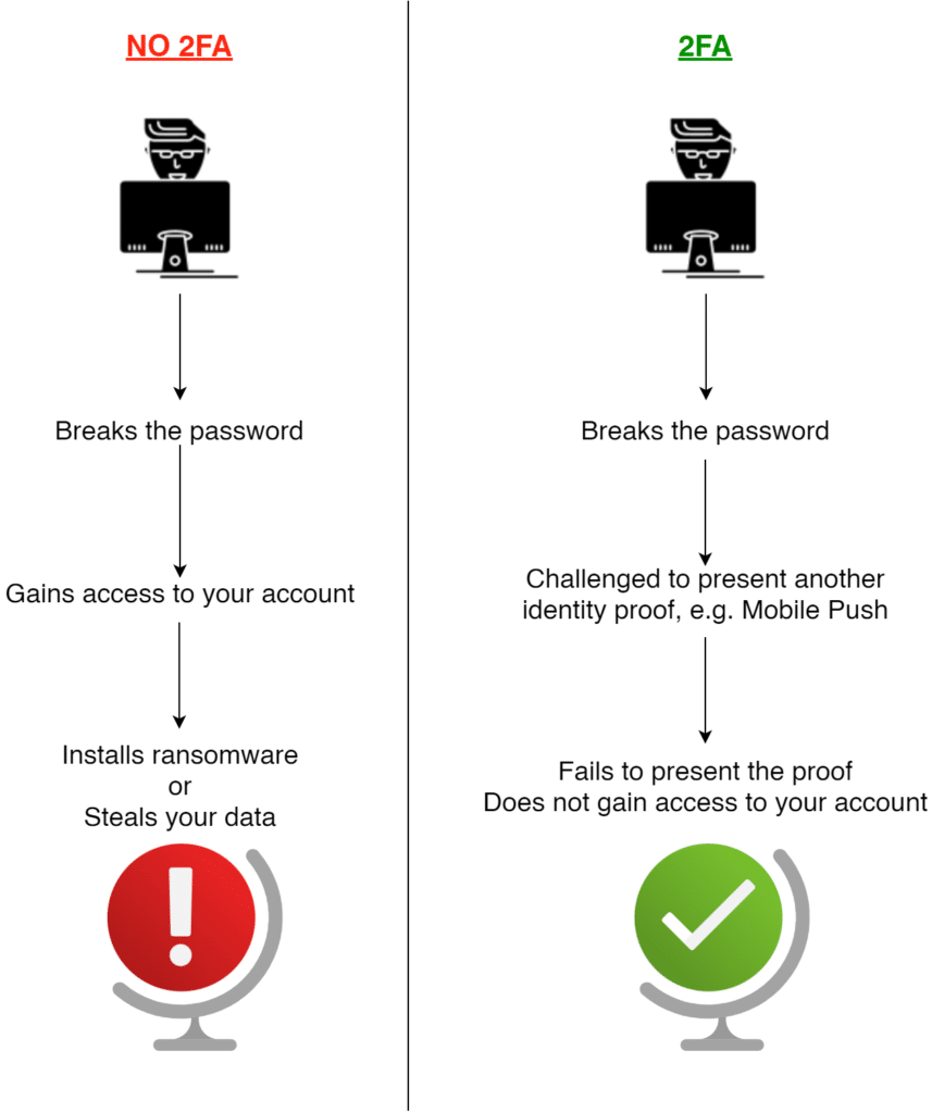 Deploying 2FA and setting up the Mobile Push authentication request transforms this one-channel authentication process into a two-channel authentication process. Now the security system requires two separate pieces of evidence. The proof that you are you is not only your password but also your phone. If you start a login process and then receive an authentication request on your phone, you can be sure that it’s you. A hacker does not have your phone so they cannot gain access to your account.