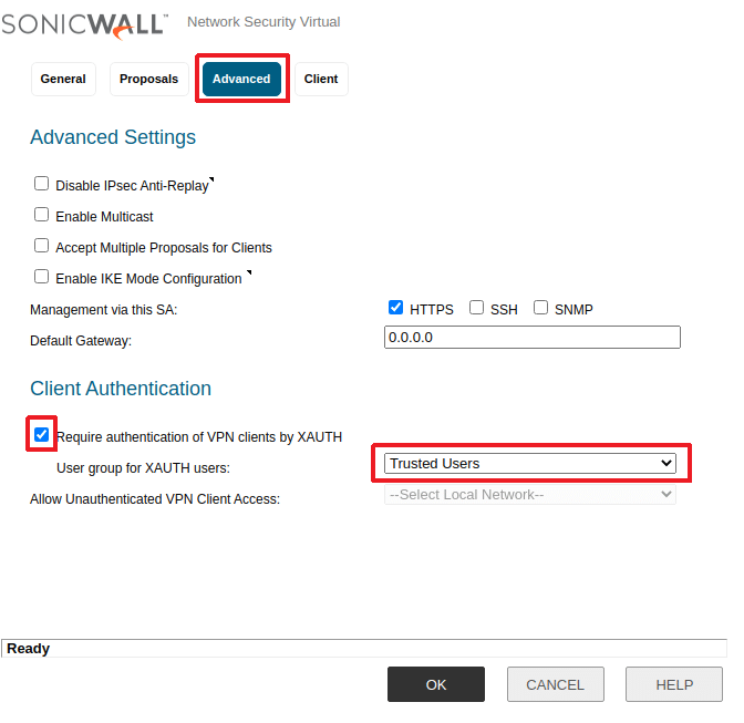5. Click the Advanced tab, and check the group selected in the User group for XAUTH users dropdown. You have to use this group in your RADIUS configuration.