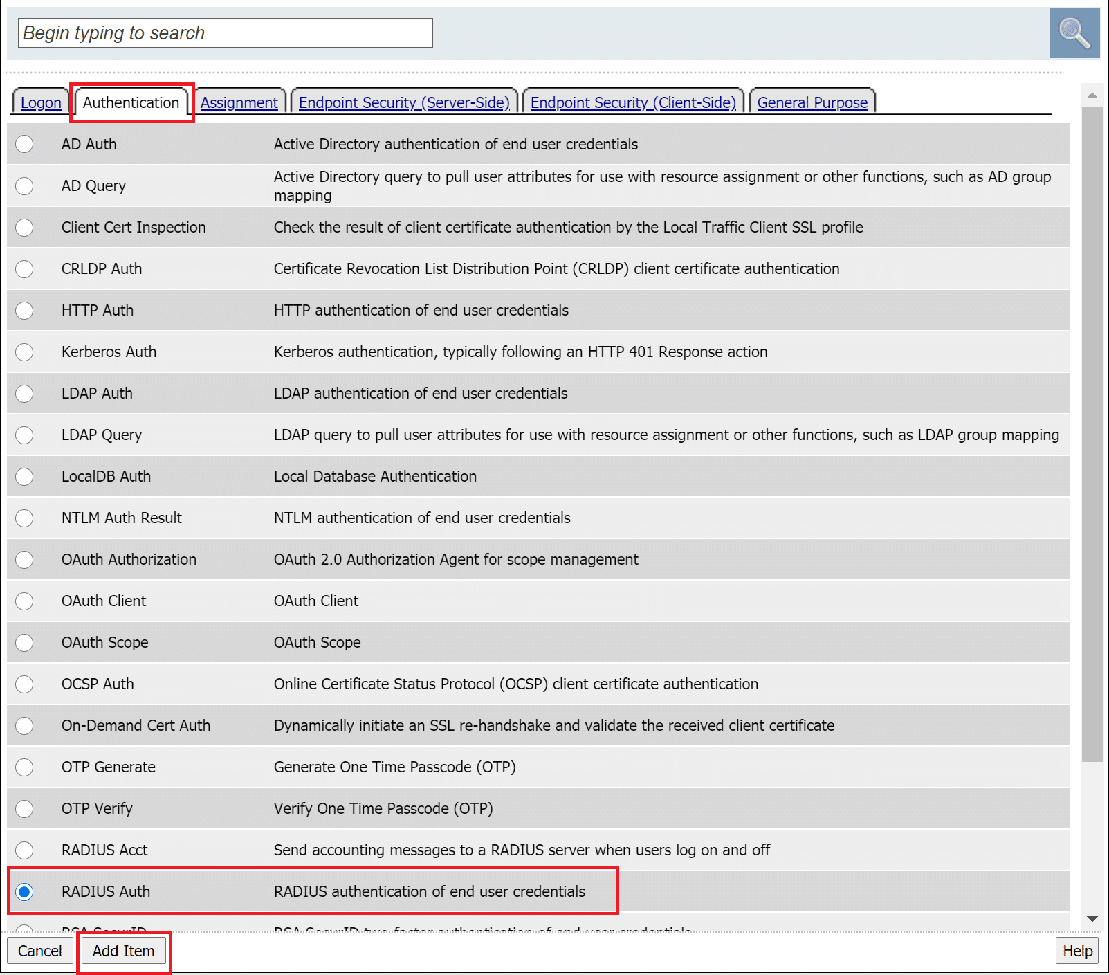 5. Select RADIUS Auth and click Add Item.