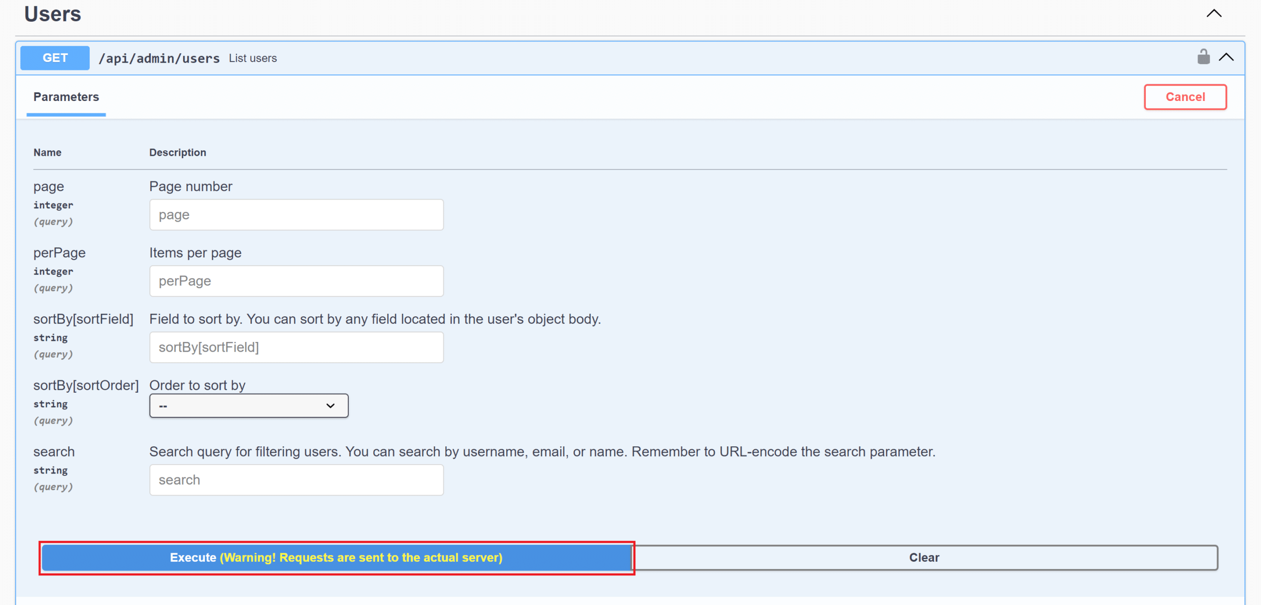 11 Select one of the endpoints, e.g., List Users, and click Send. You will receive a response.