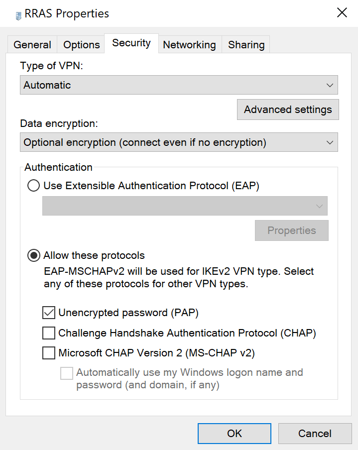 6. Go to the Security tab and change Authentication to Allow these protocols. Then, check Unencrypted password (PAP).