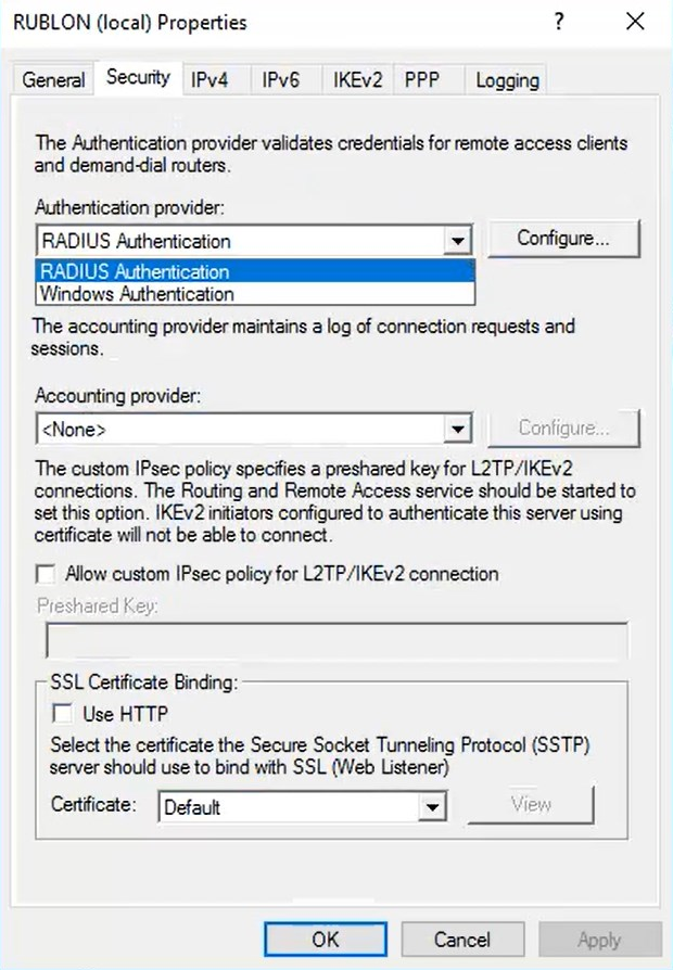 3. Go to the Security tab and locate Authentication provider. Select RADIUS Authentication from the drop-down list.