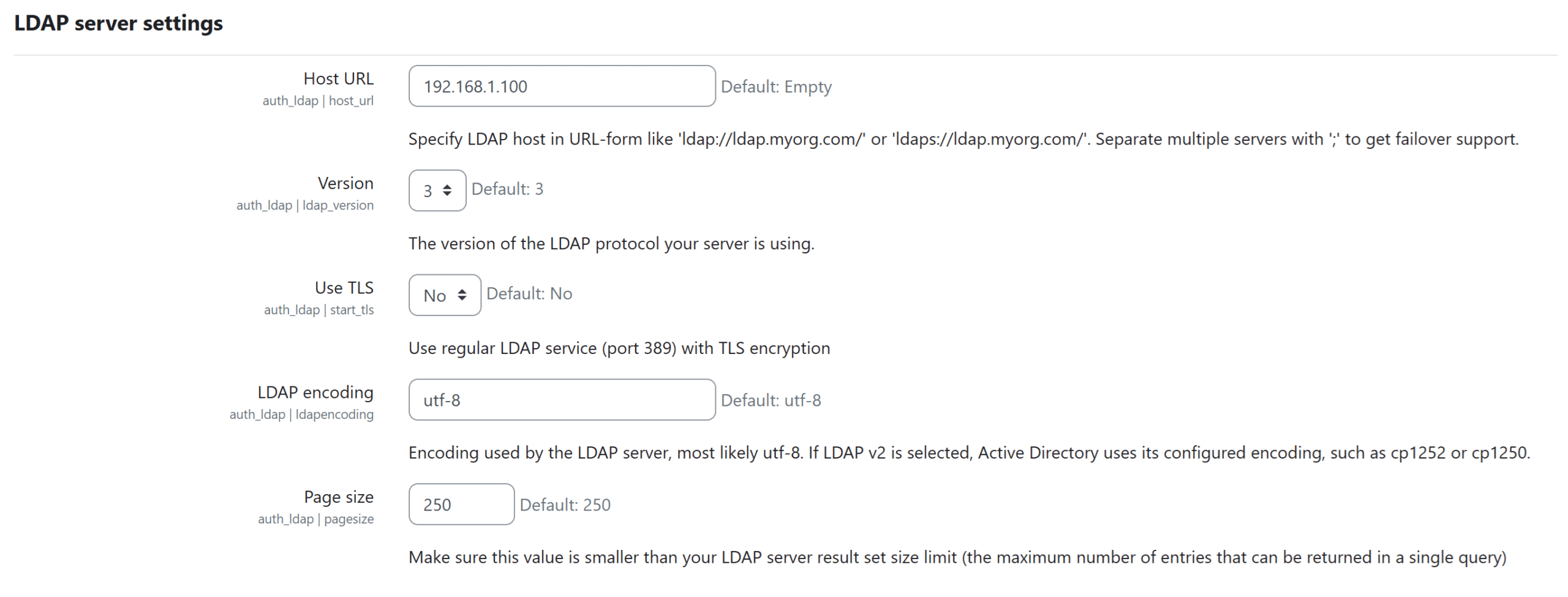 Keep the default values of all other options in this section. If you want to learn more about them or change them, refer to Moodle’s LDAP Server Settings documentation.