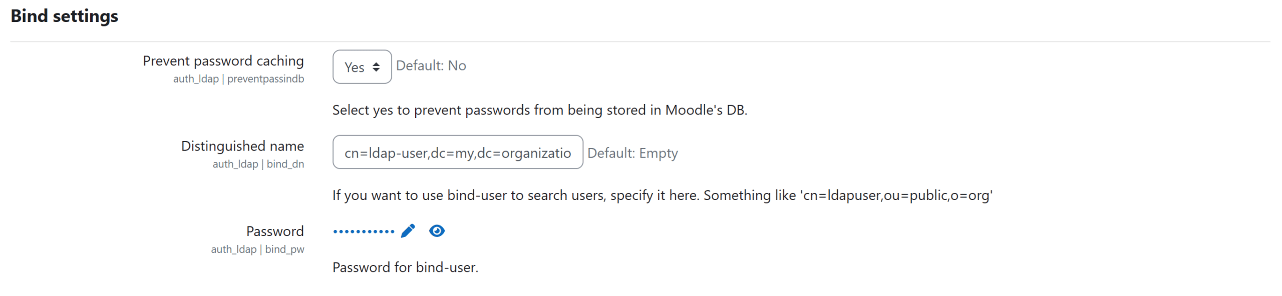 | Distinguished Name | Enter the bind user DN that Moodle will use to look up user information in the directory. This will be the same DN as the access_user_dn in the configuration file that Rublon Authentication Proxy uses to connect to its backend LDAP. Use the following form: cn=ldap-user,dc=my,dc=organization,dc=domain |