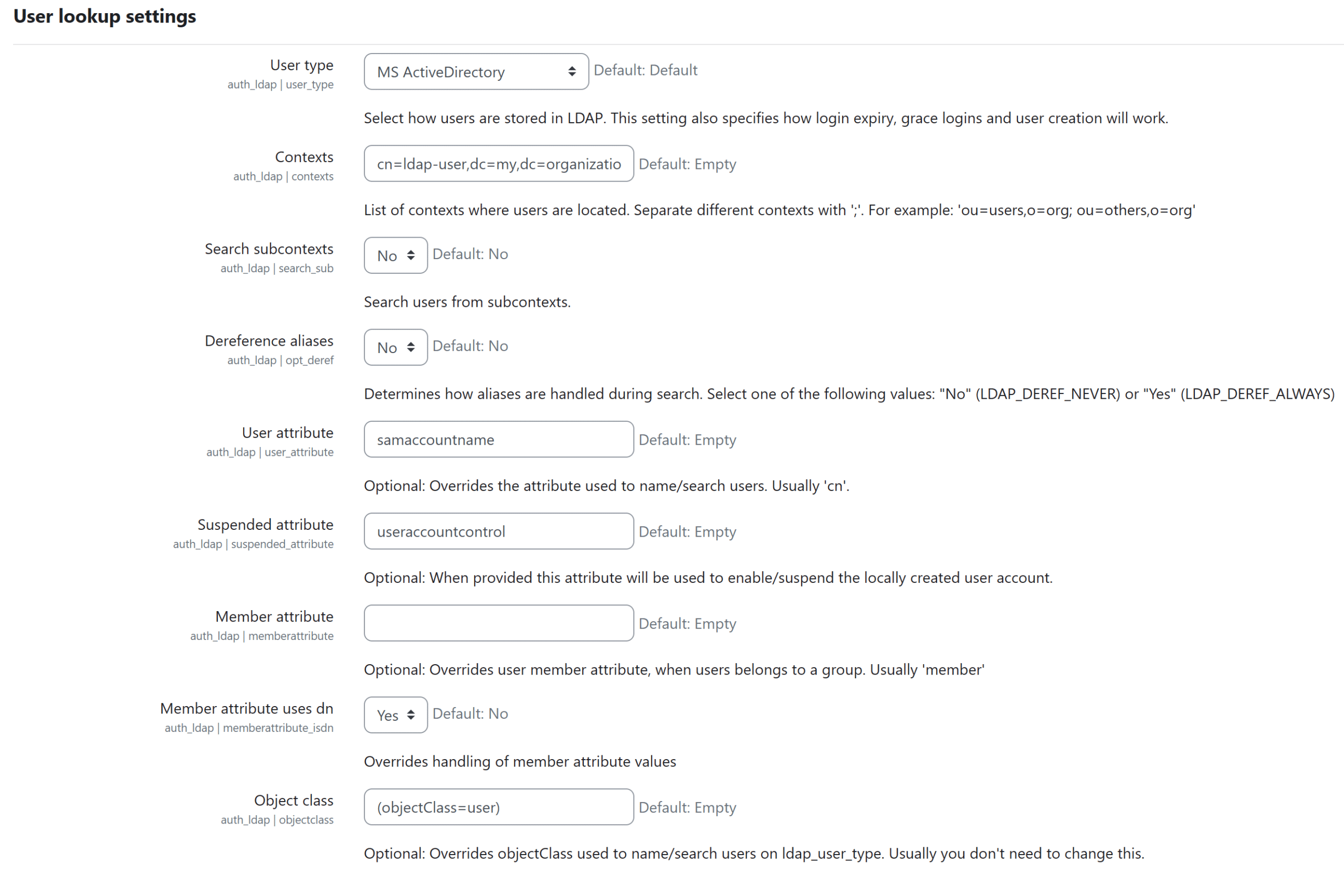 | User attribute | Enter the LDAP attribute that contains the user’s login name (what the user enters into Moodle as their username). For Active Directory, this attribute is most often samaccountname; for OpenLDAP, it’s uid. |