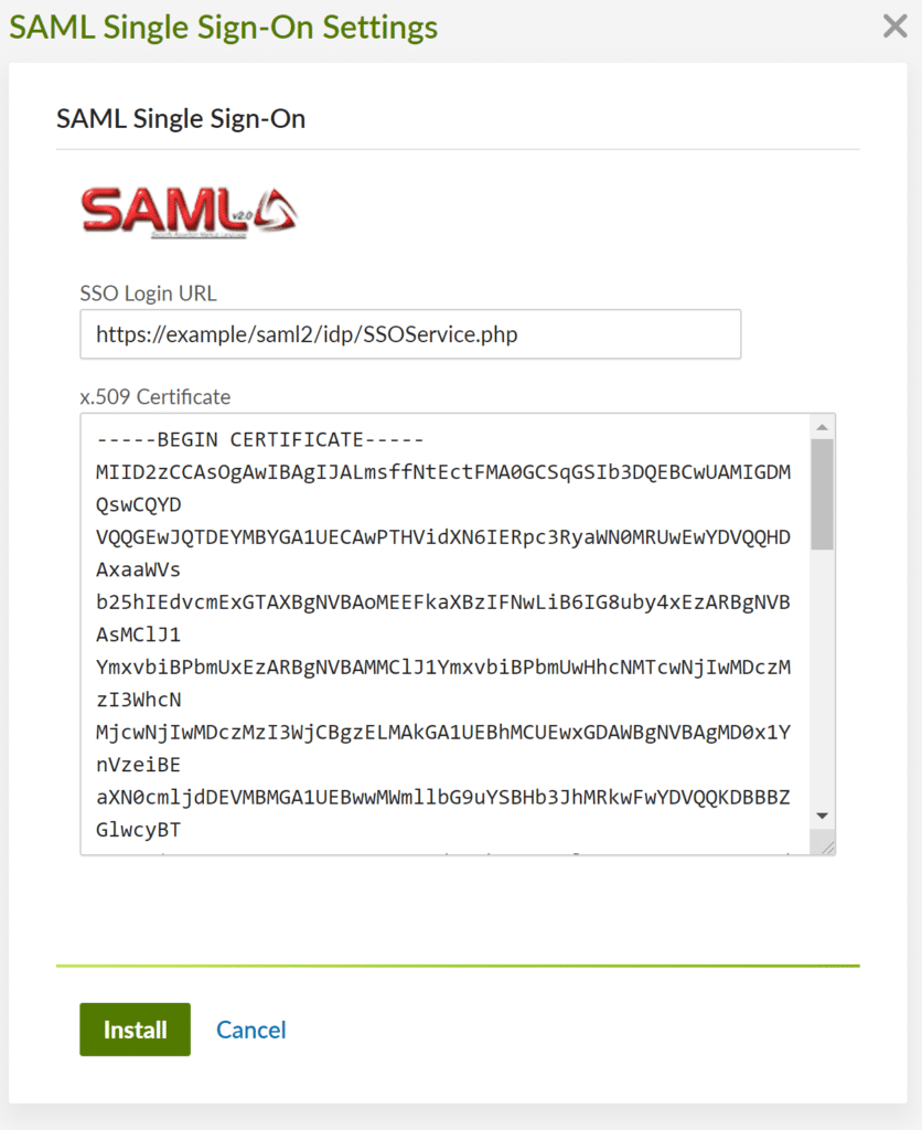 4. Scroll down, locate SAML Single Sign-On and click Install. A new form will appear.