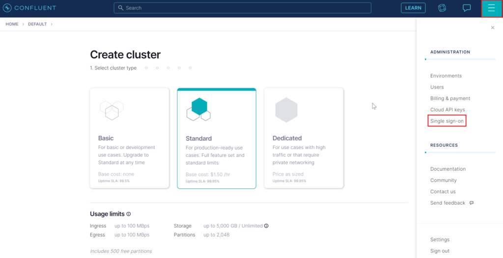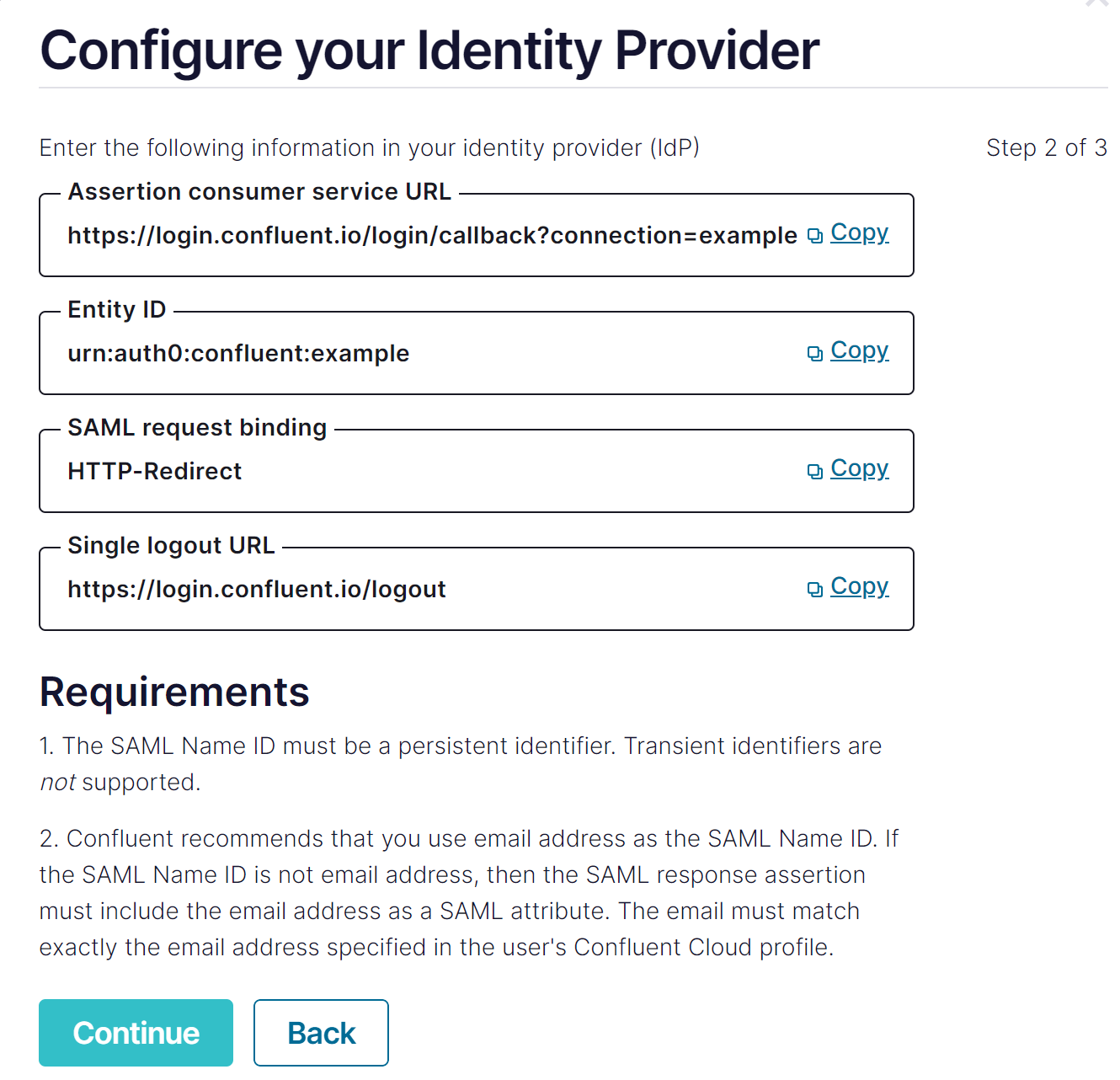 1. In Confluent, click Continue if you are still on the Configure your Identity Provider page.