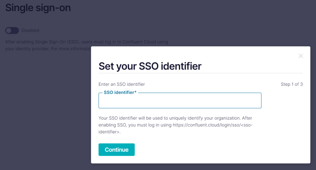 3. Enter an SSO Identifier and click Continue. This unique identifier will be used to identify your organization after enabling SSO.