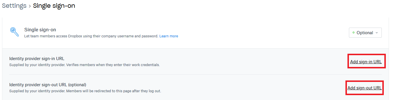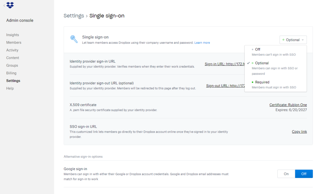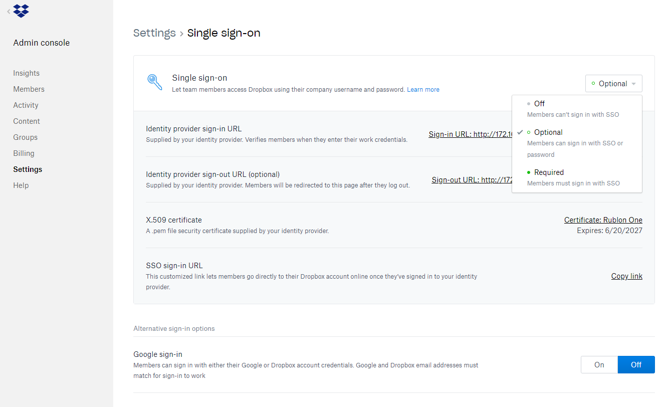 1. Log in to Dropbox as an admin, go to Admin console → Settings → Single sign-on, and select Optional or Required. Let’s choose Optional in this example.