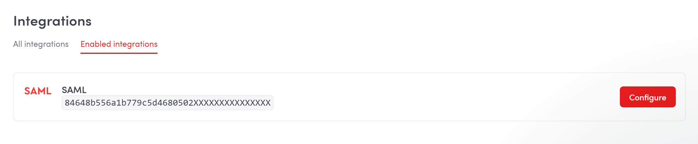 4. If installation has been completed and you have not been automatically redirected to the SAML configuration page, scroll up to the beginning of the page and click the Enabled integrations tab. Then click Configure.