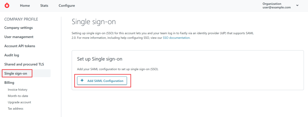 3. Select Single sign-on from the pane on the left and then click Add SAML Configuration.