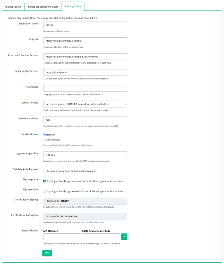 2. Fill in the form and click SAVE to add a new application. Refer to the following image and table.