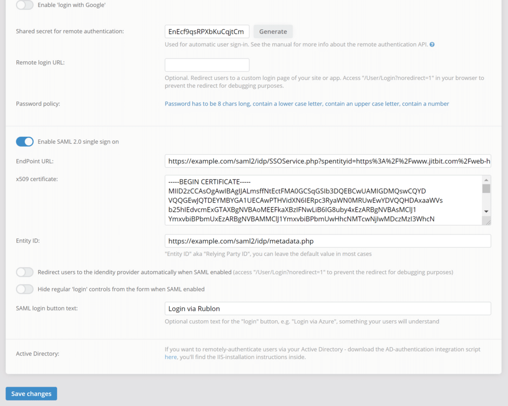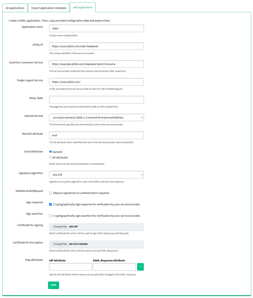 | Assertion Consumer Service | https://example.jitbit.com/helpdesk/Saml/Consume Note: Replace example with the name of your subdomain in Jitbit. |