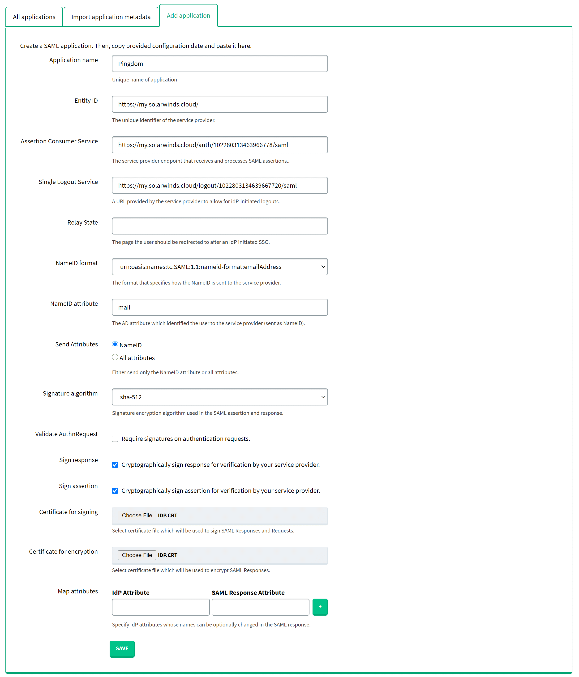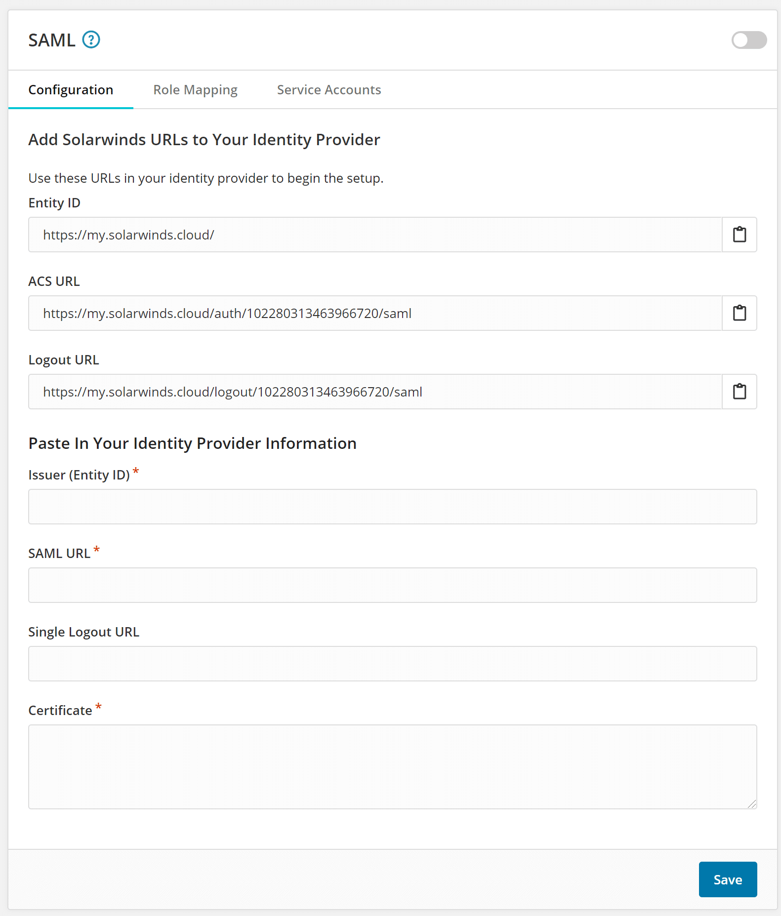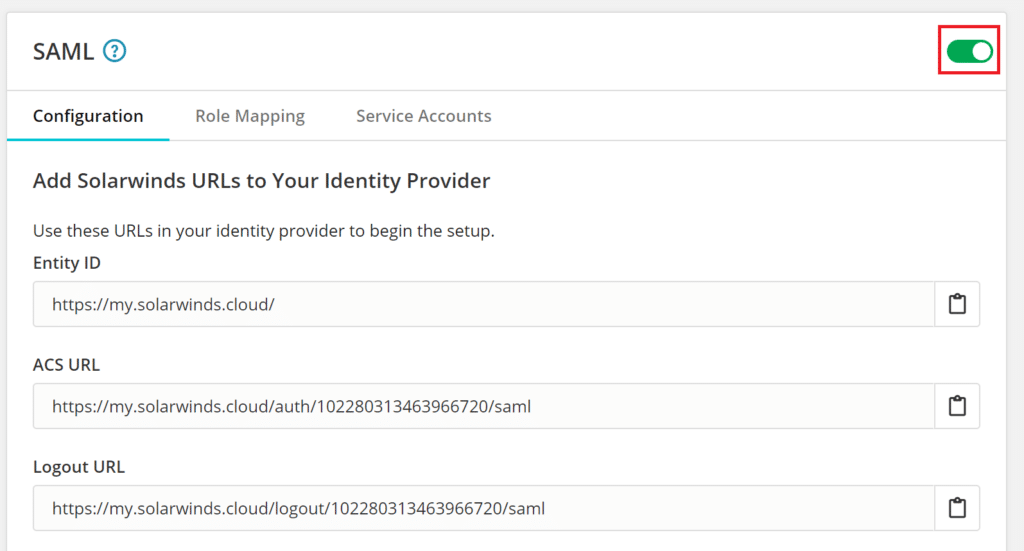 4. Write down Solarwinds URLs (Entity ID, ACS URL, Logout URL). You are going to need these values when adding a new application to Rublon Access Gateway.