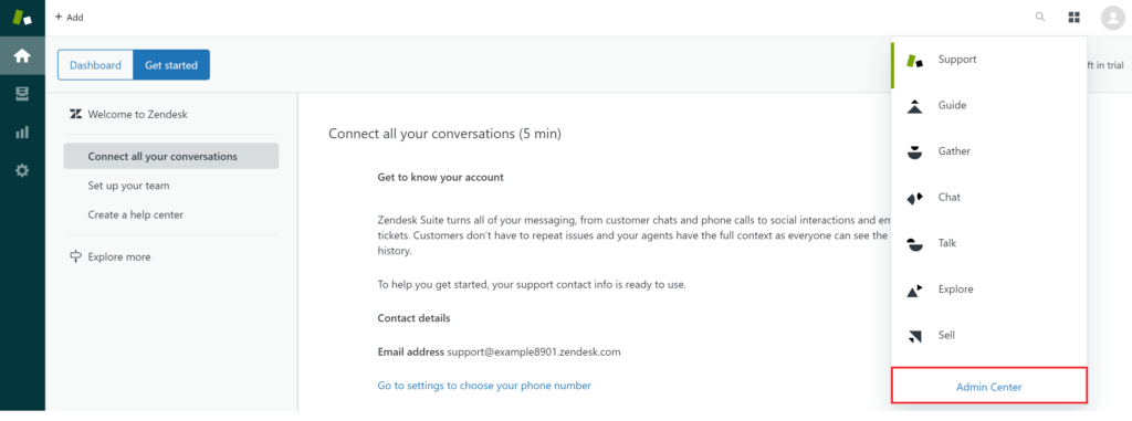 1. Click the Zendesk Products icon located in the top-right corner and select Admin Center from the list.