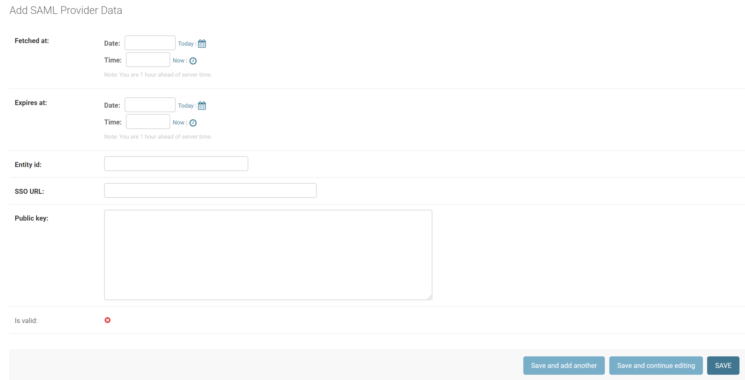 1. Go to Home → Third-party authentication → SAML Provider Data and click Add to add the provider data.