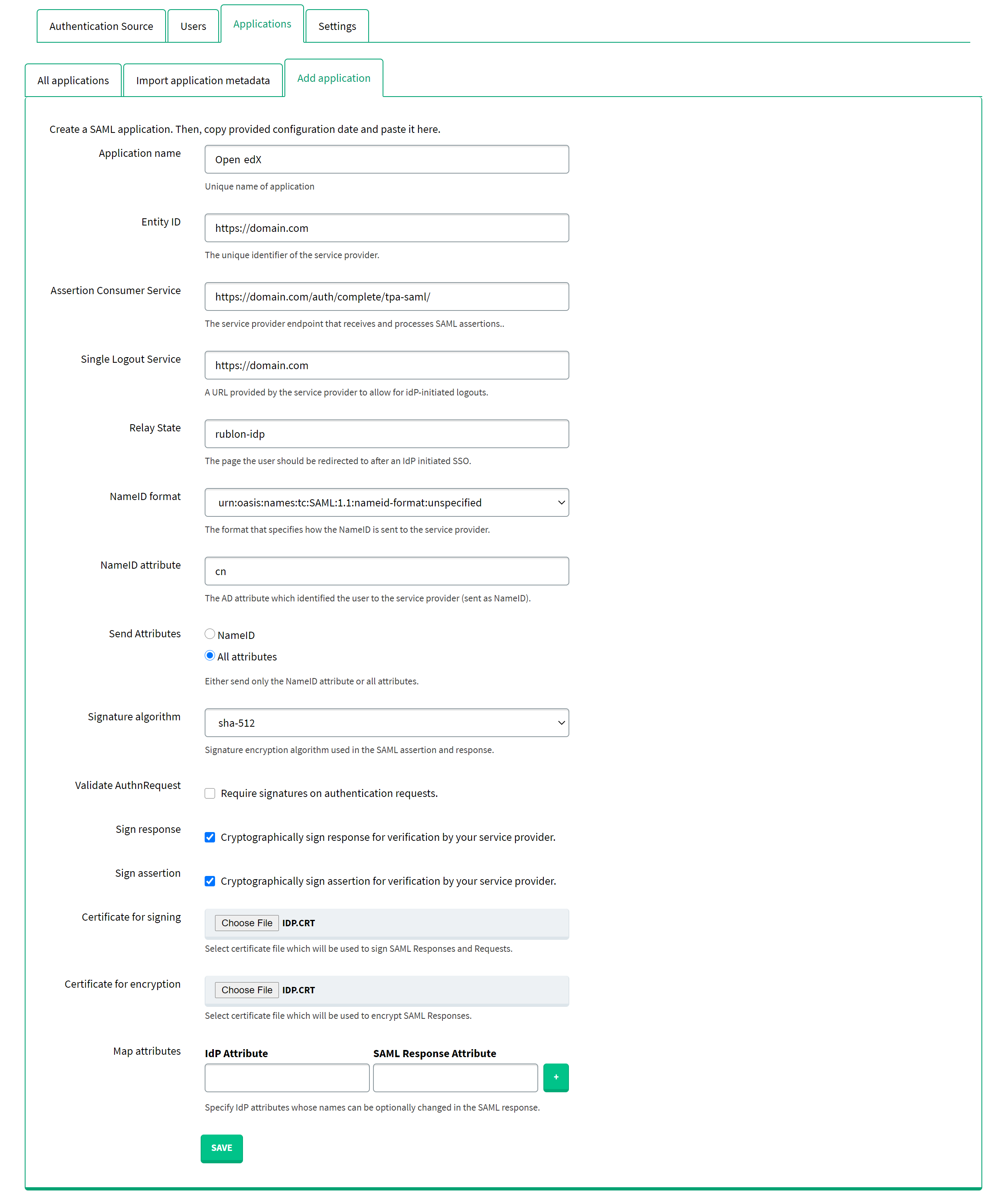 | Entity ID | This value will be used as an identifier when adding your integration to Rublon Access Gateway. Set to e.g. the Open edX domain. |