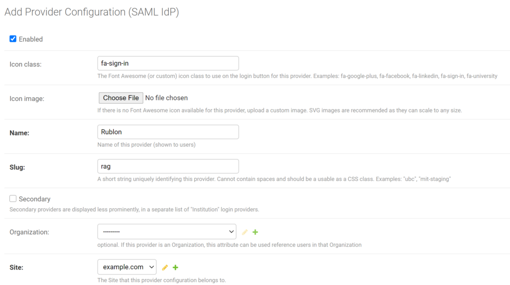 6. Define a Slug for your provider. Slug is a unique name to identify a provider. A slug cannot contain spaces, so replace spaces with dashes, e.g. rublon-idp.