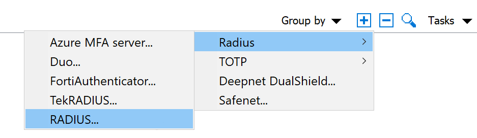 3. Click the + (plus) icon in the upper-right corner and then select RADIUS → RADIUS….