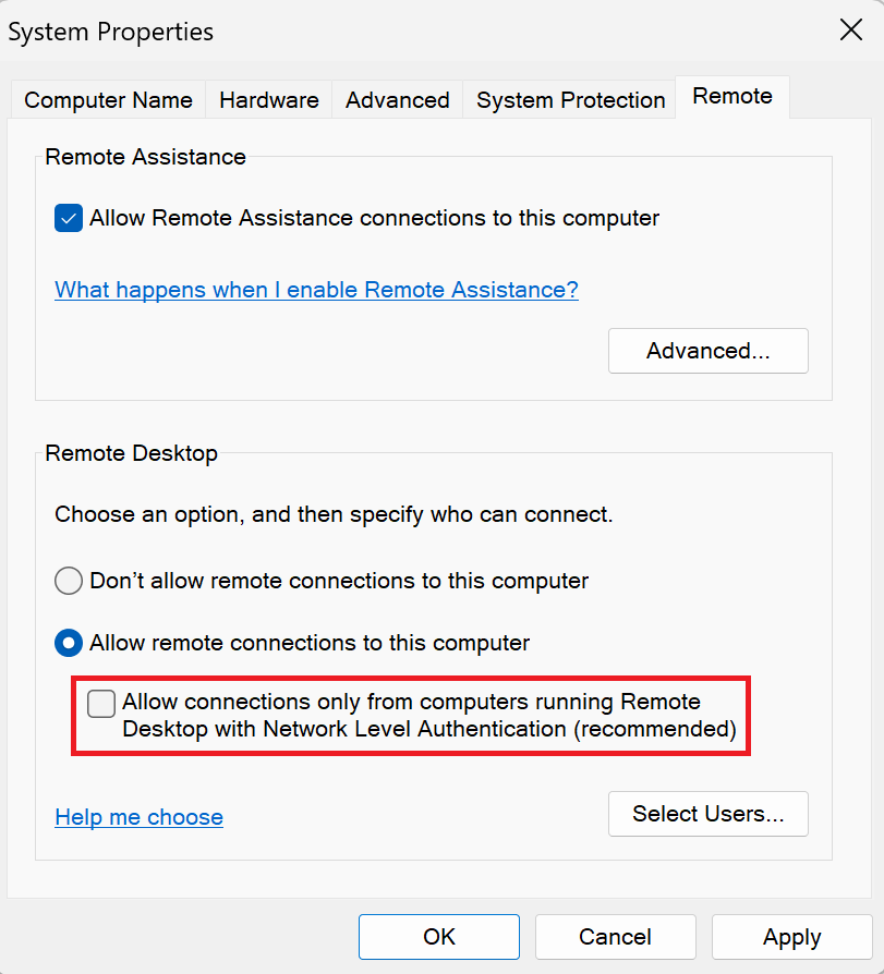 3. Uncheck Allow connections only from computers running Remote Desktop with Network Level Authentication and click OK to save the change.