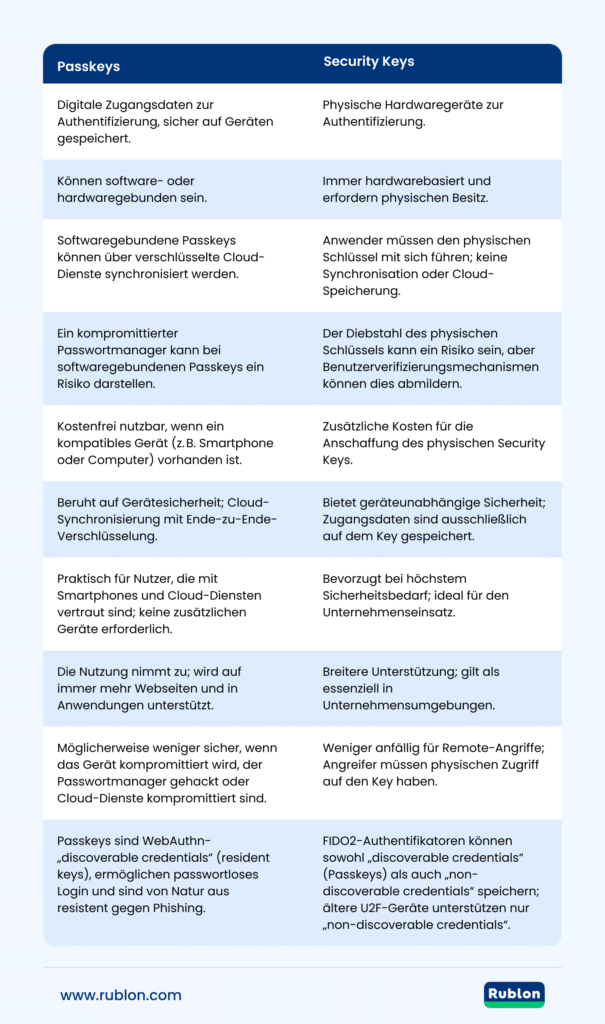 Deshalb haben wir eine kompakte Tabelle vorbereitet, die die wichtigsten Unterschiede zwischen Passkeys und Security Keys übersichtlich darstellt.