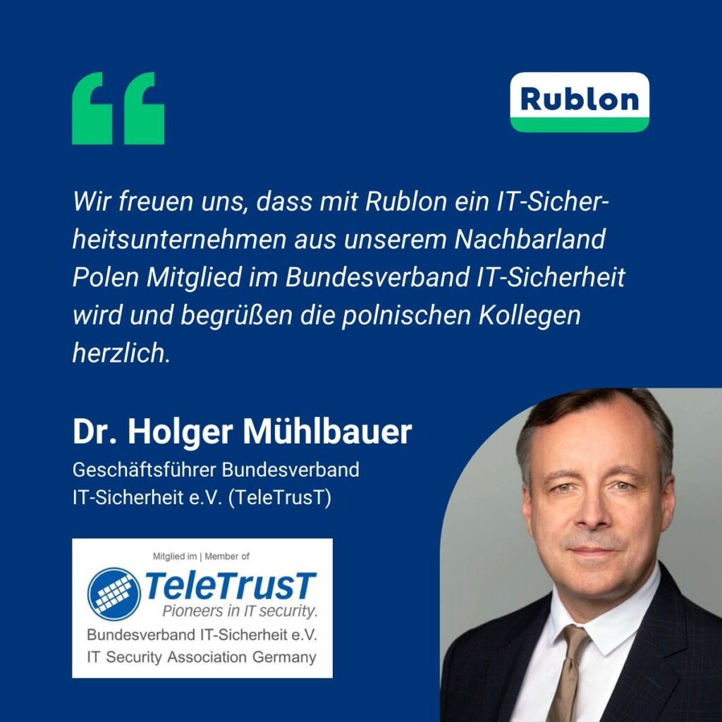 „Wir freuen uns, dass mit Rublon ein IT-Sicherheitsunternehmen aus unserem Nachbarland Polen Mitglied im Bundesverband IT-Sicherheit wird und begrüßen die polnischen Kollegen herzlich. IT-Sicherheit ist eine grenzüberschreitende Herausforderung, gerade vor dem Hintergrund aktueller politischer Entwicklungen. Umso mehr ist uns an internationaler Zusammenarbeit gelegen. TeleTrusT versteht sich deshalb als Kompetenznetzwerk, das in- und ausländische Mitglieder aus Industrie, Verwaltung, Beratung und Wissenschaft sowie thematisch verwandte Partnerorganisationen umfasst. Im europäischen Kontext ist der Verband u.a. Träger des PKI-Vertrauensverbundes ‚TeleTrusT European Bridge CA‘ sowie des Vertrauenszeichens ‚IT Security made in EU‘ und Mitglied des European Telecommunications Standards Institute (ETSI). Der Beitritt von Rublon bereichert diese europäische Perspektive.“