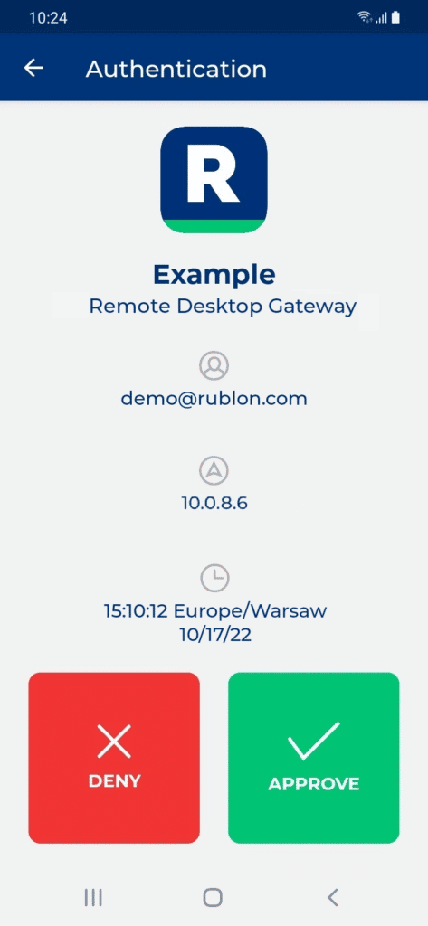 Multi-Factor Authentication (MFA) for Remote Desktop Gateway is a secure extra layer of authentication for Microsoft Remote Desktop Gateway logons. During the authentication process, Rublon sends a Mobile Push login request to the user if they have the Rublon Authenticator app installed. Apart from the Mobile Push authentication method, Email Link, Phone Call, and SMS Link can also be used. Users who do not complete the Two-Factor Authentication process are denied access.