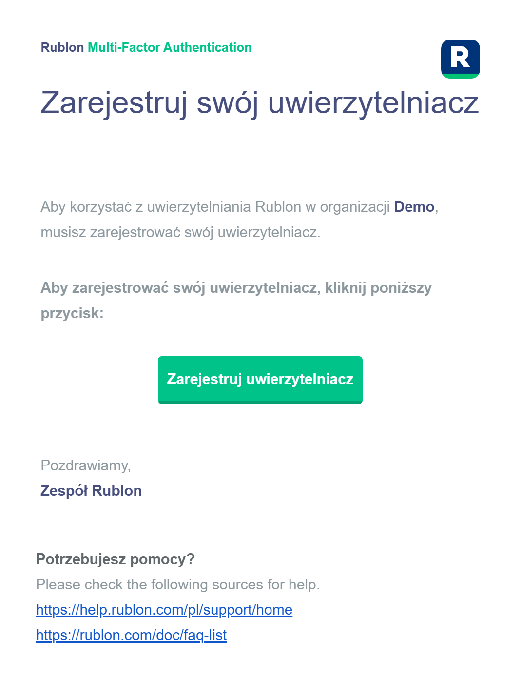 Jeśli Twój administrator wysłał Ci E-mail rejestracyjny, przejdź do Zarejestruj aplikację Rublon Authenticator.