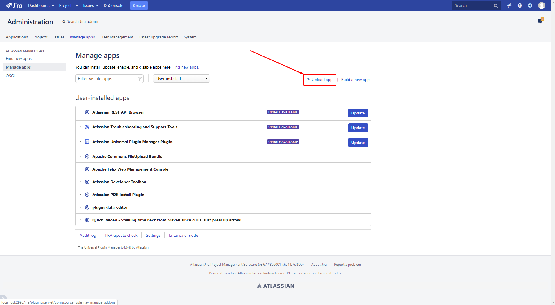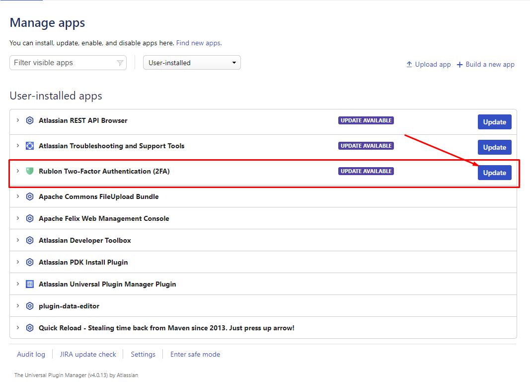 To update the Rublon Jira MFA Plugin to the latest version, you need to go to the Manage apps tab of Administration in your Jira server. Then, find Rublon Multi-Factor Authentication (MFA), and if an update is possible, you will see the Update button, as shown in the picture below.