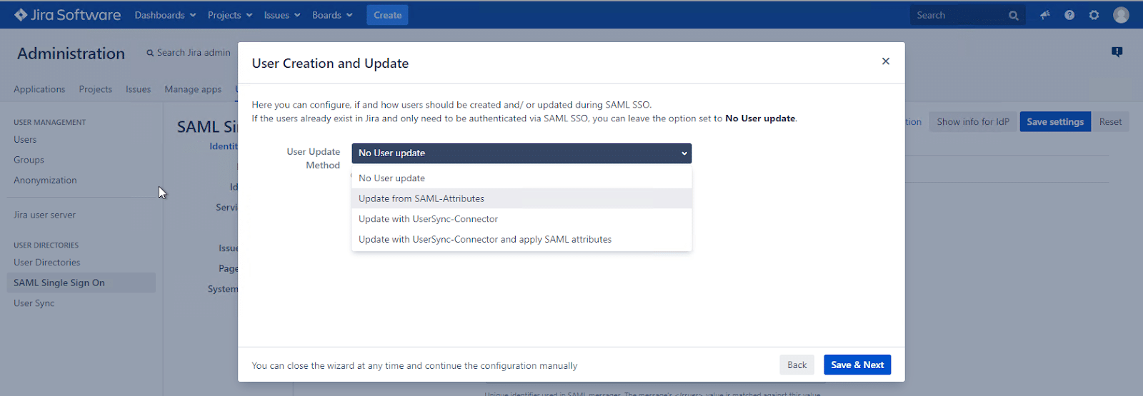 13. The SAML Single Sign On for Jira plugin allows adding new users to Jira, but you do not need this option in your configuration, because you synchronize users with Microsoft Active Directory instead. Select Update from SAML-Attributes and click Save & Next.