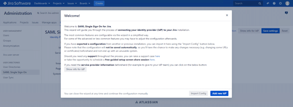 Installing the SAML Single Sign On for Jira plugin (or another plugin for Single Sign On) allows you to connect to an external identity provider (Rublon Access Gateway in our case). This is a required and next step after synchronizing your users.