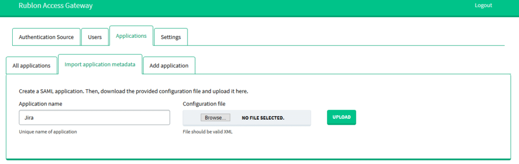 9. Enter the Application name and select the metadata file you just downloaded from Jira. Click UPLOAD to add the new application.