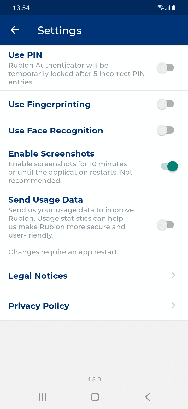 When enabled, Rublon Authenticator will send us your usage data. Usage statistics can help us make Rublon more secure and user-friendly. However, agreeing to send us your usage data is fully optional and up to you. This option is disabled by default.