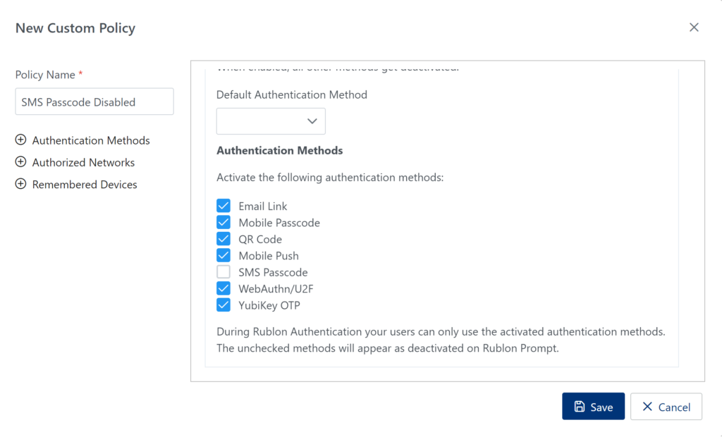 Disable the SMS Passcode authentication method for external users
