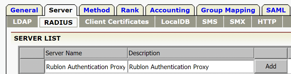 7. Enter Server Name (e.g. Rublon Authentication Proxy) and Description. Click Add.