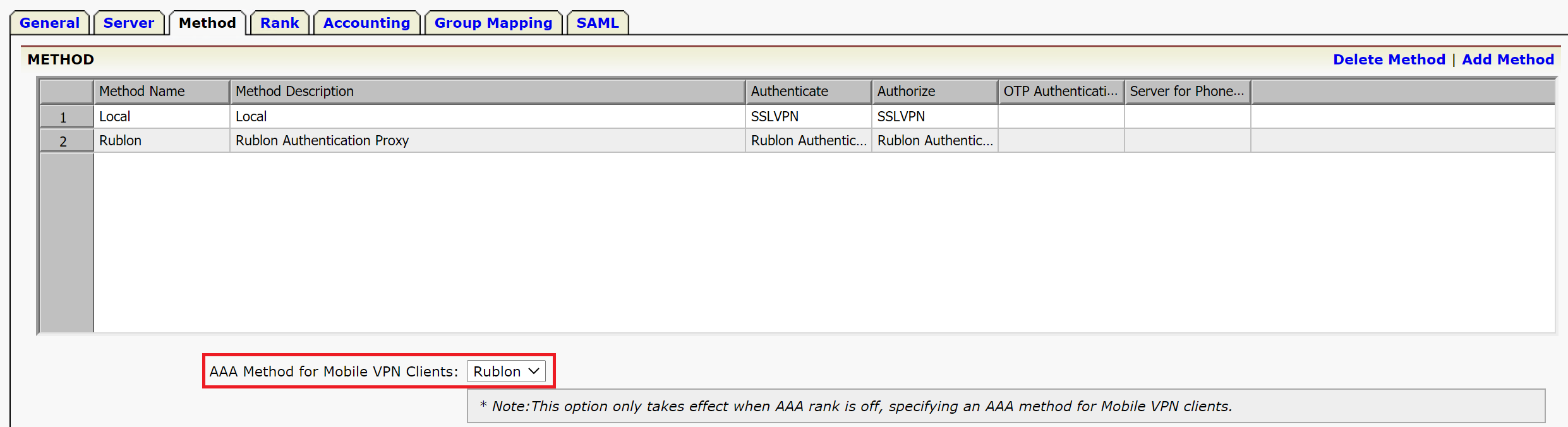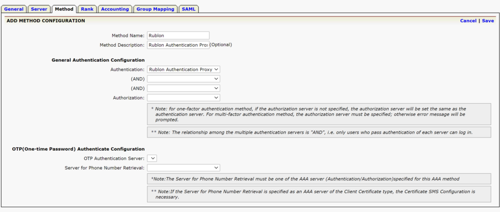 11. Enter Method Name, Method Description and select your AAA server in Authentication. The AAA server is the server you created in Step 7.