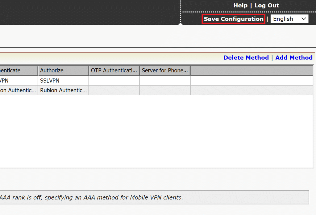 13. Navigate to the AAA Method for Mobile VPN Clients dropdown and select the method you created.