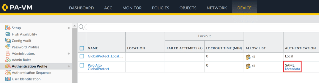 1. Go to Device → Authentication Profile.