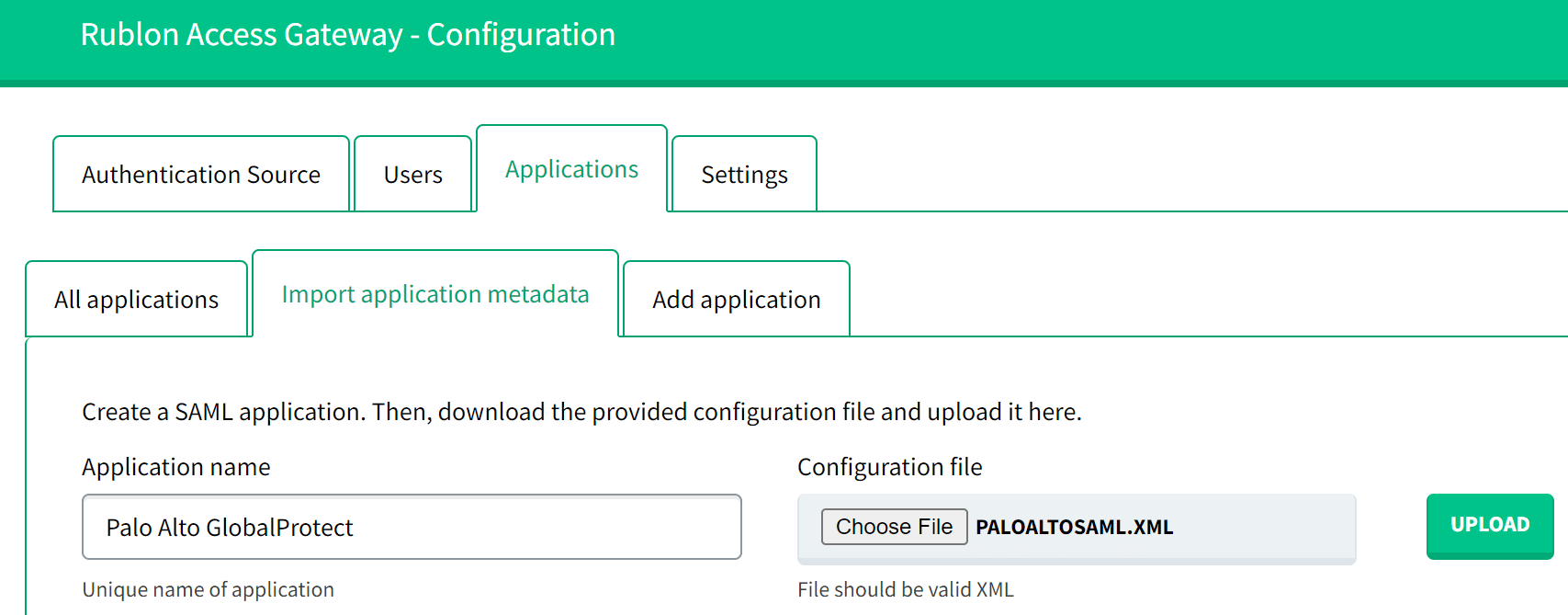 | Identity Provider Metadata | Upload the Rublon Access Gateway metadata file in XML format. You can get the metadata.xml file from Applications → Information for configuring applications with Rublon Access Gateway → DOWNLOAD METADATA. |