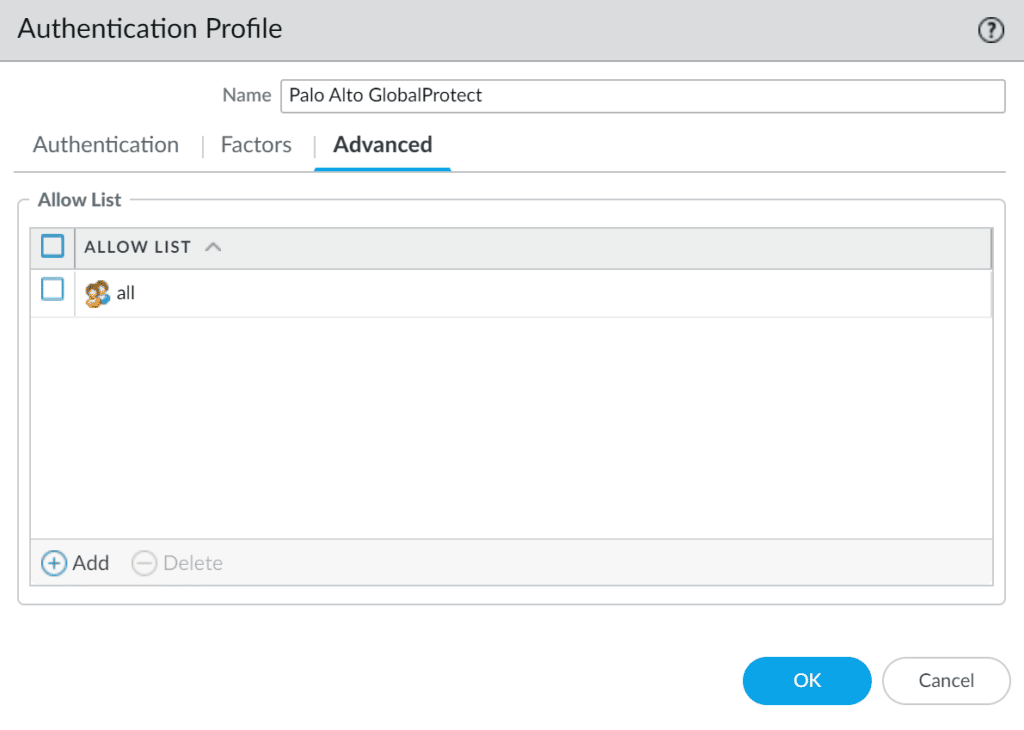 12. On the Authentication Profile window, click Advanced. In the Allow List, click the Add button and select all.