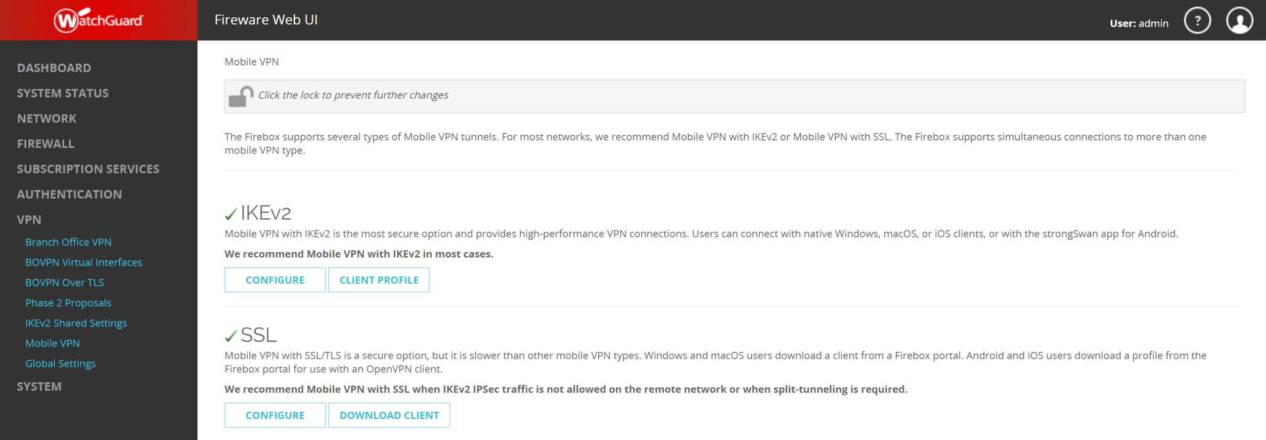 1. In the WatchGuard Firebox Admin Panel, click VPN and then select Mobile VPN.